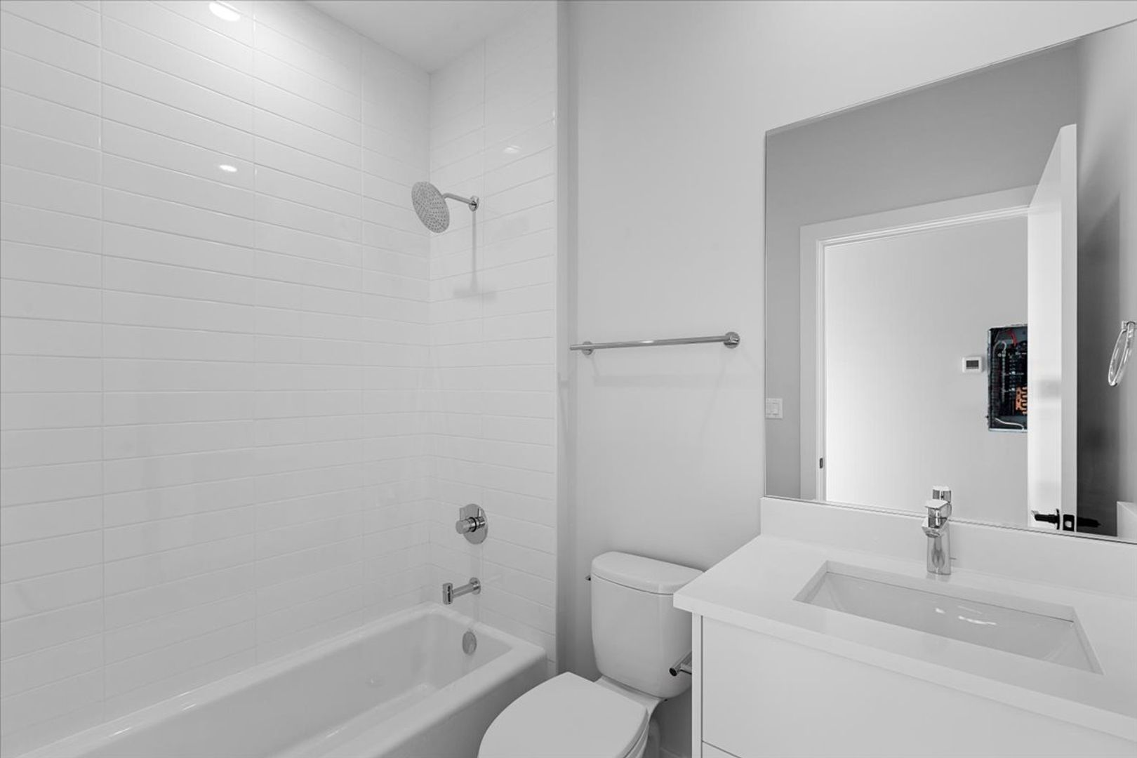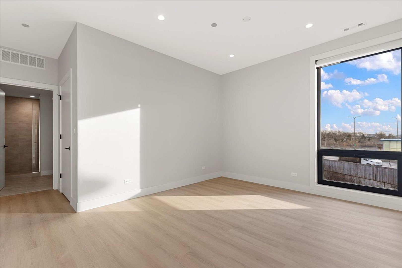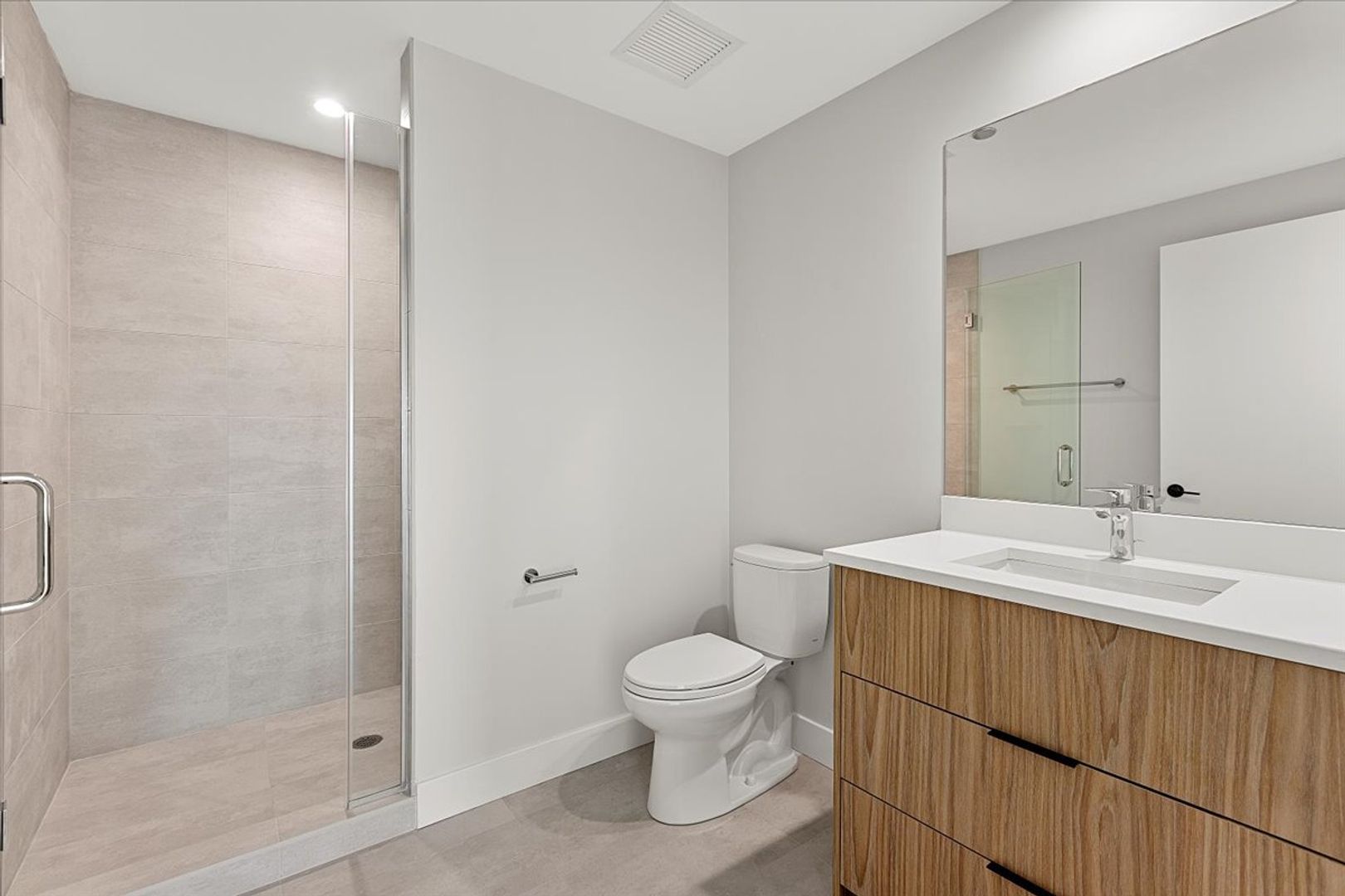 Luxurious bathrooms featuring expansive vanities with quartz countertops, porcelain tiles, and indulgent walk-in showers and tubs. Enjoy the convenience of in-unit laundry, floor-to-ceiling windows, roller shades, recessed lighting, and customizable central heat/AC for the ultimate in comfort and style.